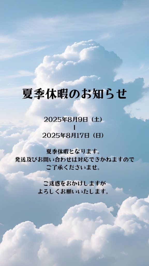 夏季休暇のお知らせ お知らせ X LINE コメント 2025.08.04 ご注文は24時間可能でございます。 休暇期間にご注文い頂いた商品は 18日以降随時発送となりますのでご了承くださいませ。 FEATHERSTEP